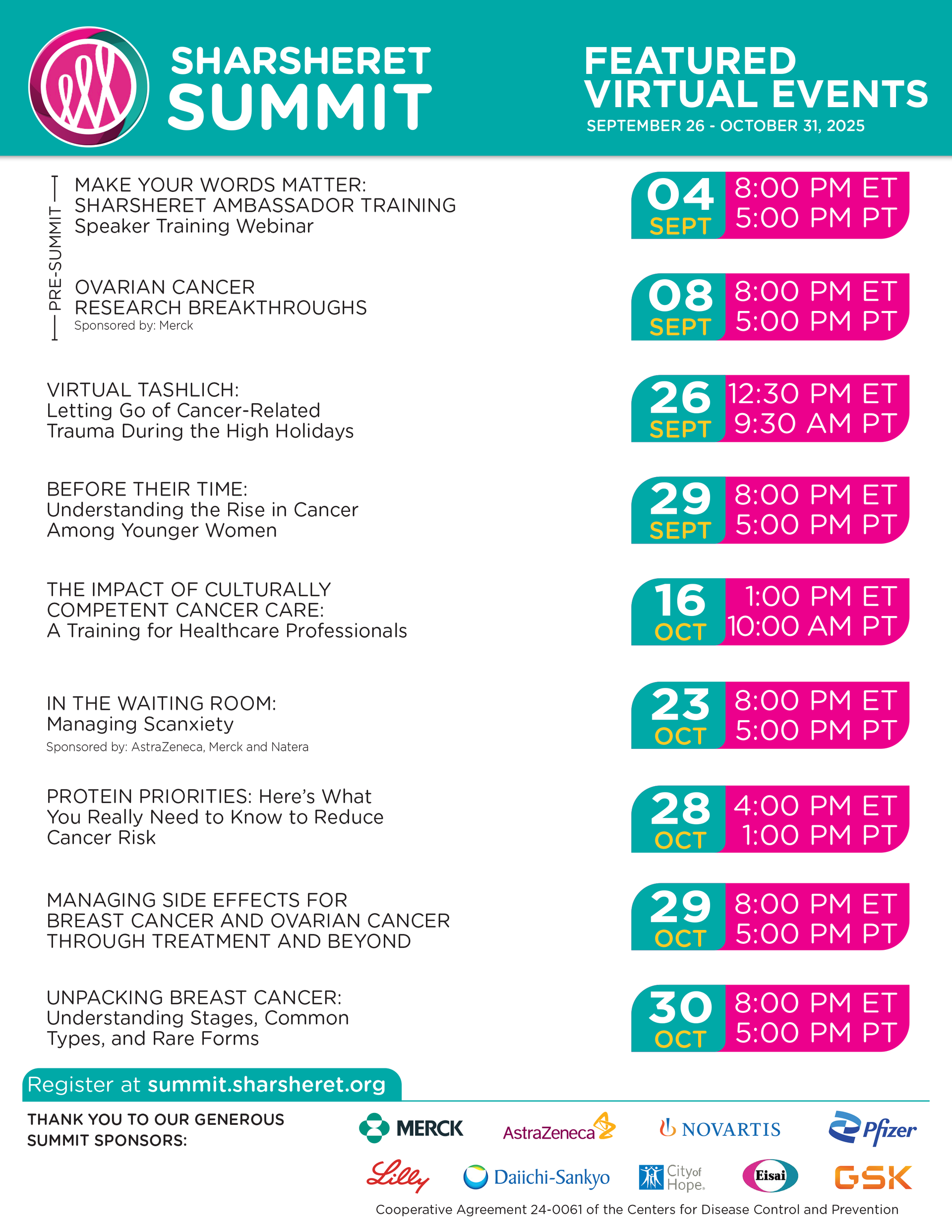 We’re excited to share an upcoming event in partnership with Sharsheret, the national Jewish breast and ovarian cancer organization. Their free annual Sharsheret Summit runs from September 26 to October 31, featuring virtual programs on breast and ovarian cancer, screening, and genetic risk, just in time for Breast Cancer Awareness Month.