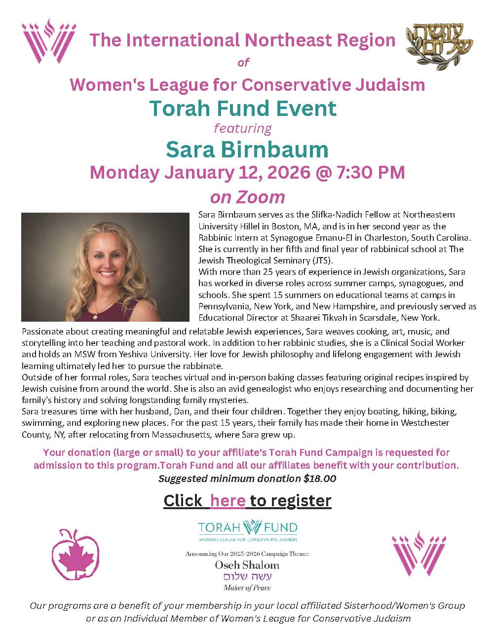Please stay tuned for additional materials that may be read at your services: letters of greeting from Women’s League International President Julia Loeb, Women’s League Torah Fund Chair Lori Snow, and Women’s League Executive Director Rabbi Ellen Wolintz-Fields, as well as a dedicated D’var Torah for Parashat Vaera to be used specifically on January 17, 2026.